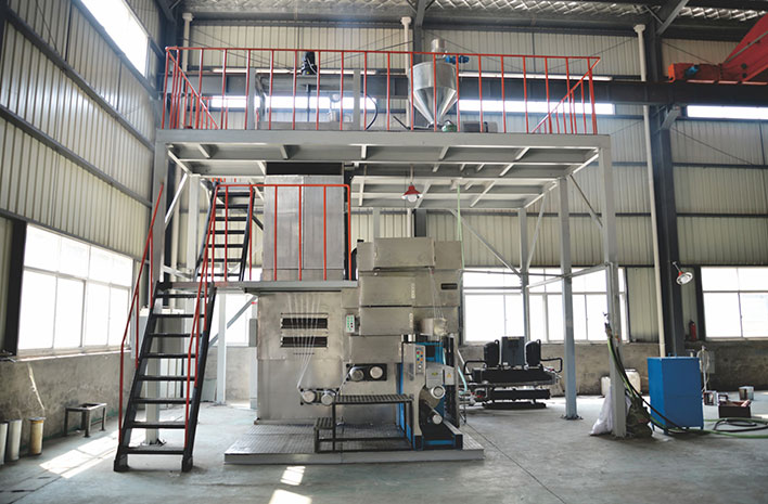 本設備主要采用溶劑溶解, 干噴濕紡法紡制芳綸1414纖維。 該纖維主要用于制作防彈衣,防彈頭盔,防刺防割服等等。生產(chǎn)工藝流程:設備包括原料溶解裝置, 雙螺桿擠出機,脫泡裝置,過濾器,漿液分配管道,計量泵及其傳動裝置,紡絲組件,水浴系統(tǒng),水洗堿洗牽伸機, 水洗機,烘干機,油輪上油裝置,熱定型機和卷繞機組成。